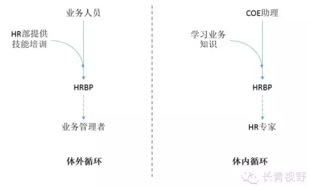 体外循环:从业务部门选拔合适的人才,由HR部门进行培养使其掌握基本的HR技能,然后担任HRBP,这样的HRBP未来既可以继续担任HRBP,又可以作为储备干部回到业务领域。有HRBP工作经历的人才回到业务领域担任管理工作之后,自然就成为了“具备HR管理理念的管理人才“,对于企业整体的人力资源管理能力提升是有巨大帮助的。华为早年刚推行三支柱模型时,HRBP是由基层干部的候选人担任,2年以后,可以选择继续做HRBP,也可以再轮岗回到业务部门成为管理者。这就是体外循环的经典范例。